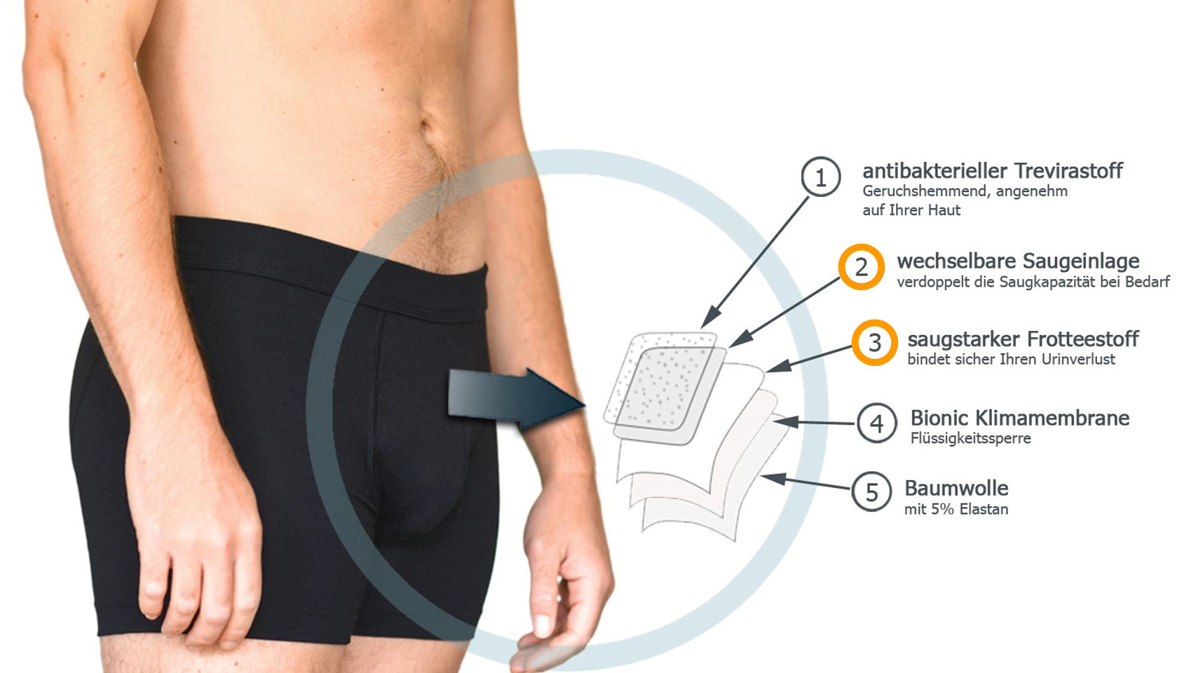 - Stufe 3 » Bionic Klima-Membran » diese wasserdichte und dennoch atmungsaktive Flüssigkeitssperre verhindert das Austreten von Urin und sorgt so für Sicherheit und Schutz Ihrer Kleidung.