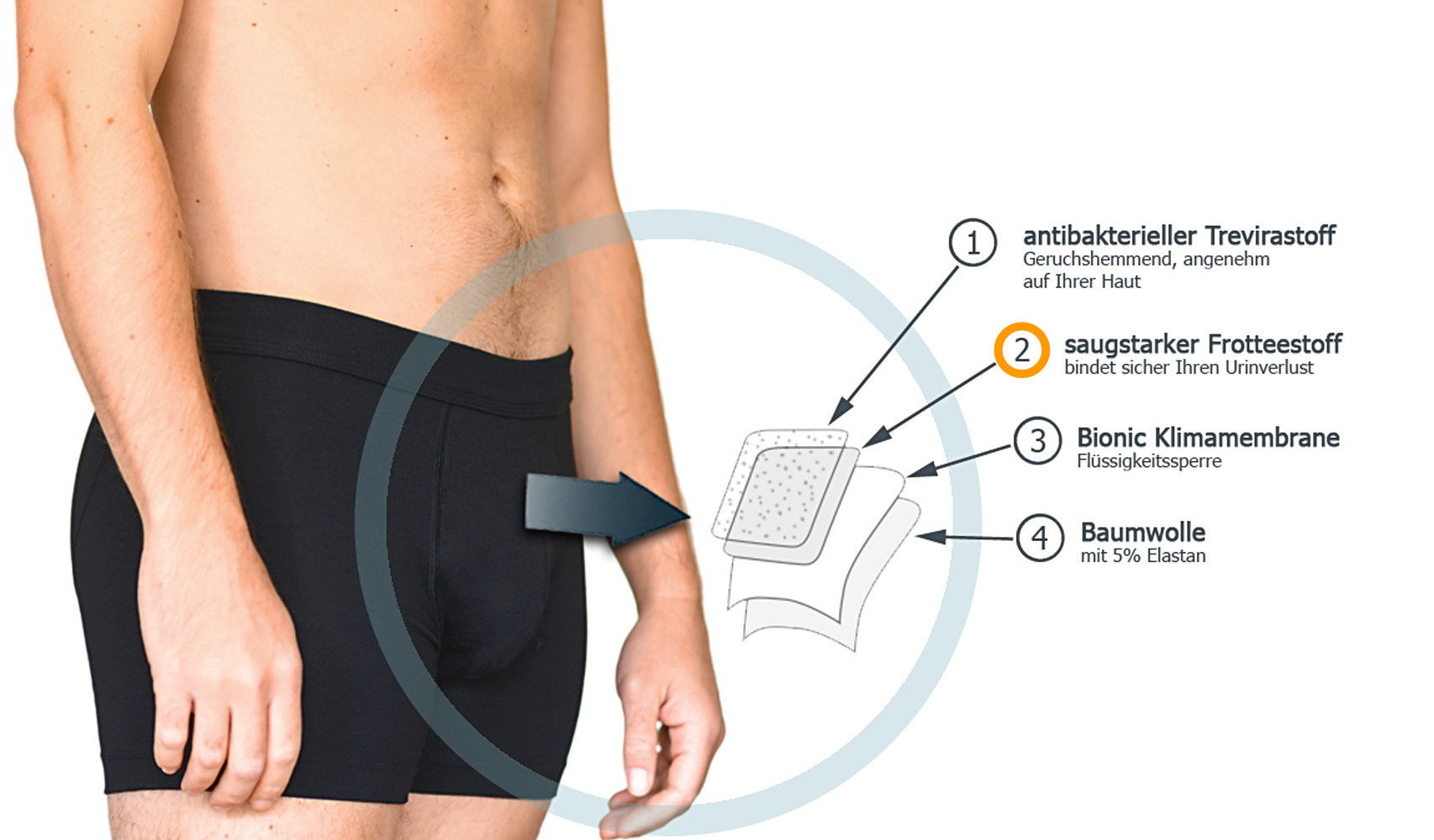 - Stufe 1 » Trevira®-Stoff » antibakteriell, weich und angenehm auf der Haut, transportiert dieser Stoff Urin effektiv in die darunter liegende Frottee-Schicht und kann so auch die Geruchsbildung reduzieren.